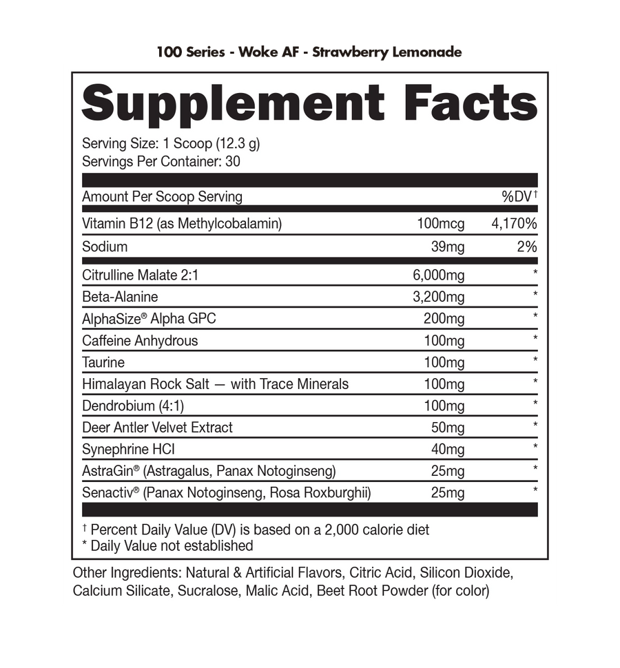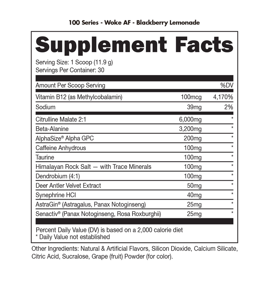 Limited to just 100 mg of caffeine, our 100 Series is everything you’ve come to expect from our high-quality pre-workout formulas- pump, focus, energy, hydration, endurance* – without the side effects of loads of caffeine. WOKE AF™: More intensity, insane pumps, and next-level focus to get that extra rep.