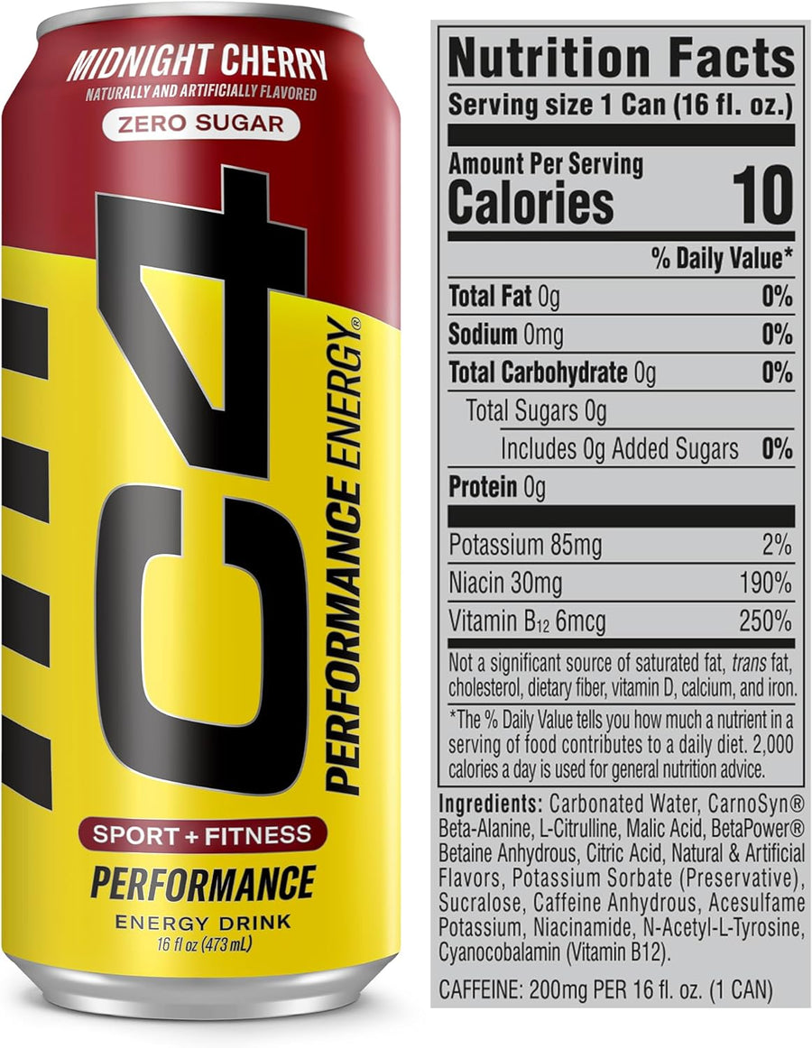 C4Energy Cellucor C4 Carbonated Energy Drink HighlightsFor athletes of all types, from the gym to the court, on the field and in the ring, C4 Performance Energy® fuels sport + fitness performance. When every second matters, there’s no room for compromise. That’s why C4 Performance Energy® powers explosive energy and endurance with 200mg of caffeine and CarnoSyn® Beta Alanine. Made with clinically studied ingredients, ZERO grams of sugar or artificial colors, and carrying the NSF Certified for Sport® label, C4 Performance Energy® is the athlete’s choice for elevating performance.