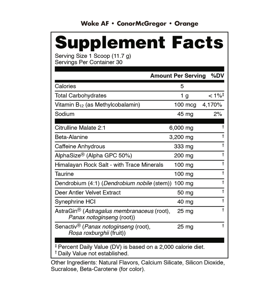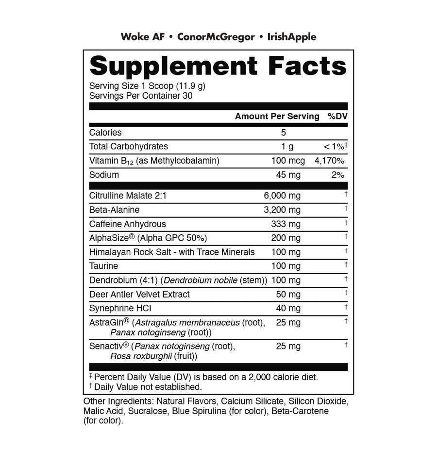 Bucked Up x Conor McGregor WOKE AF Highlights: Presenting our exclusive partnership with the #1 representative of the fightin’ Irish, the notorious Conor McGregor. WOKE AF, the high stim formula you love, in 2 bold new flavors handpicked by the champ himself: Orange (with a hint of vanilla) and Irish Apple.